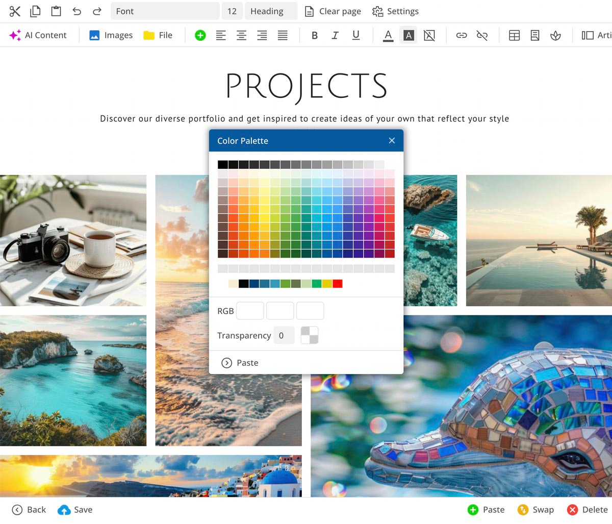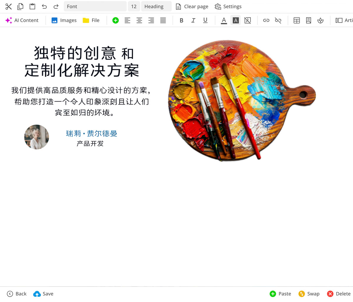 Editoren giver dig forskellige skabeloner til sidesektioner, der er præcist tilpasset det valgte layout. En integreret AI hjælper med at generere og optimere tekster.