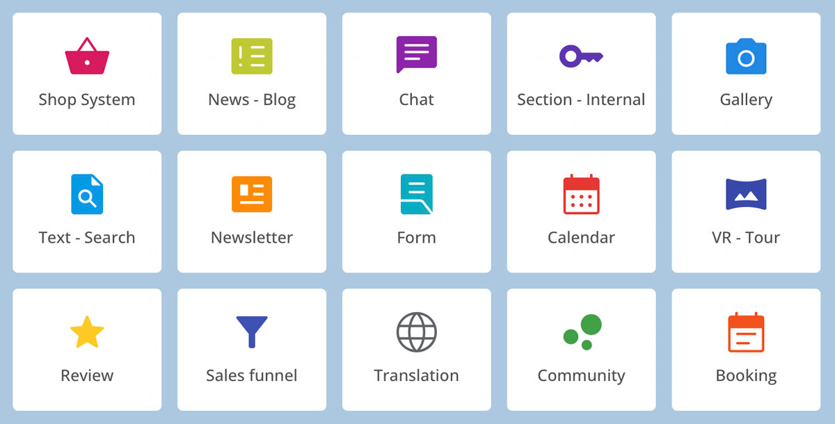 Formularer med Captcha-beskyttelse, bookingsystem, VR-rundgange, kalender, galleri, password-beskyttede områder for registrerede brugere, kundebedømmelser og meget mere.