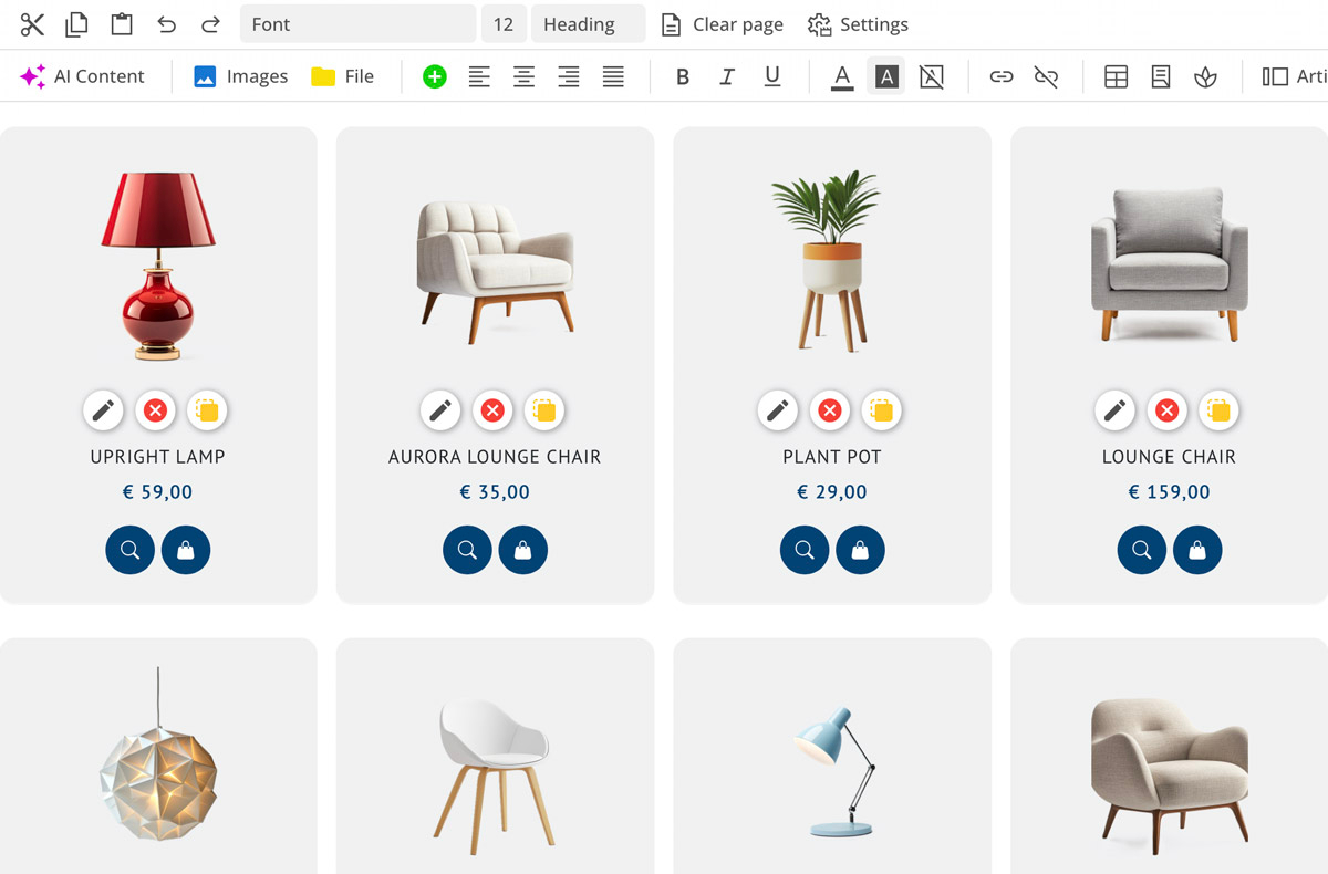 Artikellister kan importeres, og billeder tildeles automatisk. Også webshoppens indhold kan oversættes til op til 24 sprog ved hjælp af AI.