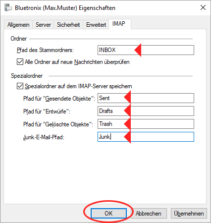 Klicken Sie auf KontenEigenschaften und anschließend auf die Registerkarte IMAP.